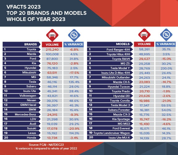 In comparison, MG, the best-performing Chinese brand, sold 58,346 vehicles in 2023, ranking seventh in Australia, largely benefiting from its British heritage.