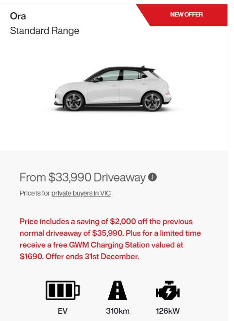 Great Wall Motors (GWM) had already cut the price of its Ora (Good Cat) model from AUD 39,990 to AUD 35,990 (now 33,990, even cheaper), making it the most affordable electric vehicle in Australia at the time.